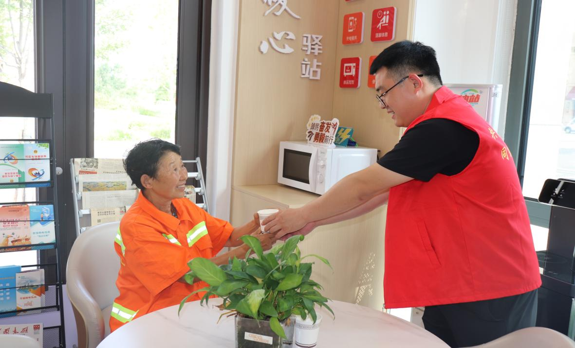外賣員梅予冬說:“這可太方便了!以前沒地方歇腳,手機沒電了,干著急。現在能到暖新驛站吹空調、喝熱水、給手機續個電,跟弟兄們嘮兩句,心里美滋滋的。這驛站就像路上的‘家’,讓我們能更好地給大家跑腿服務! ”