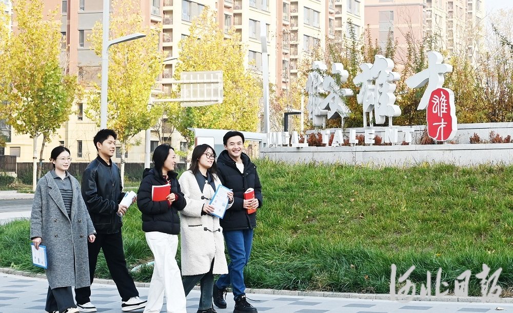 11月11日,雄安新區(qū)容東片區(qū)街頭,一群年輕人前往雄才大廈咨詢人才政策。河北日報記者劉光昱攝