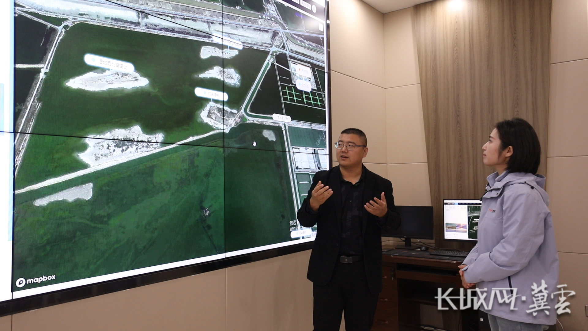 南大港產業(yè)園區(qū)文化旅游局宣傳科科長張景興向記者介紹“南大港濕地科研監(jiān)測一體化平臺”作用。長城網·冀云客戶端記者 李全 攝
