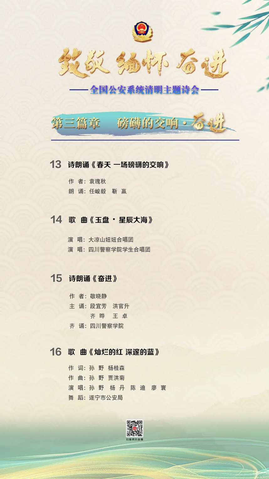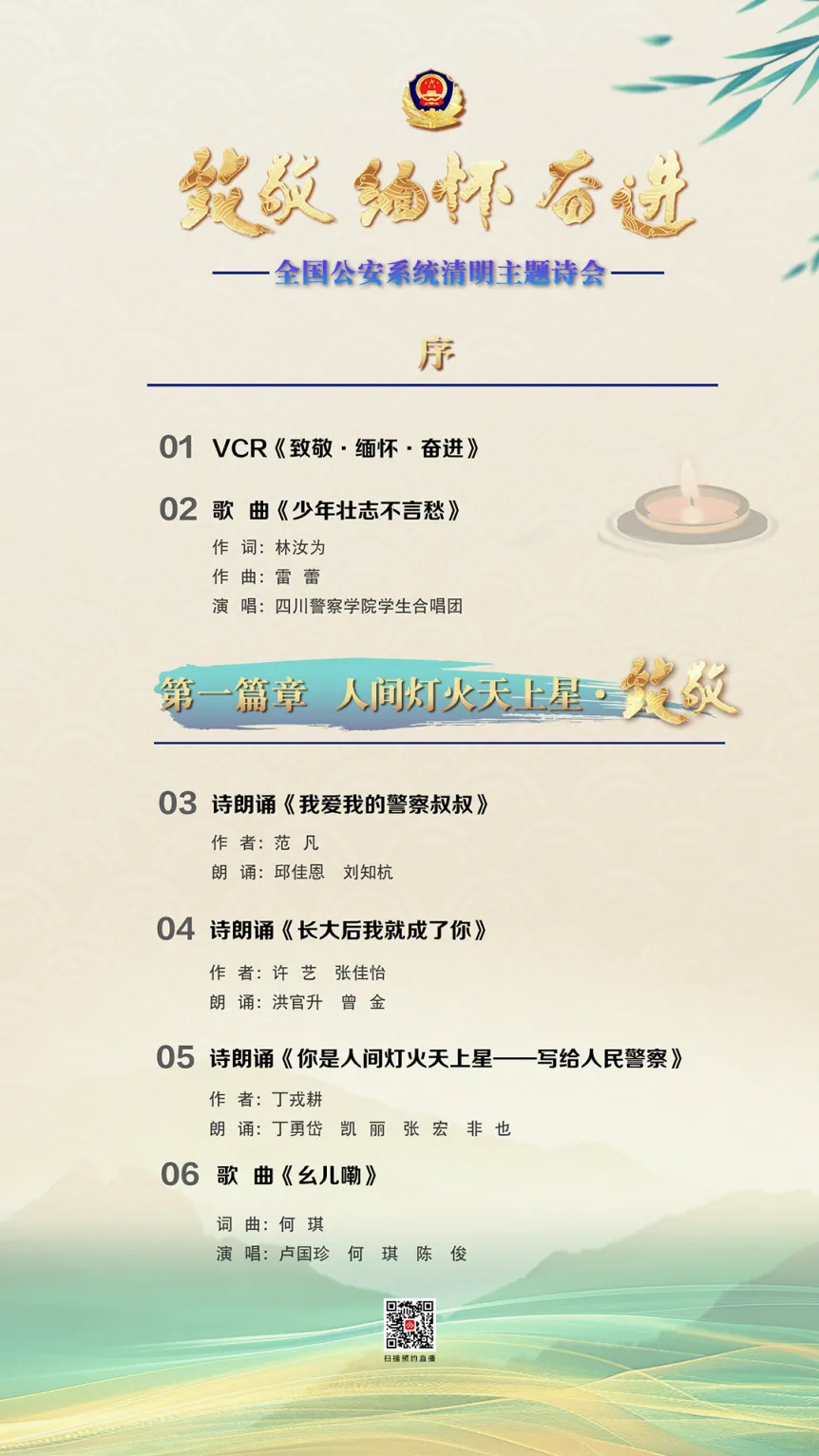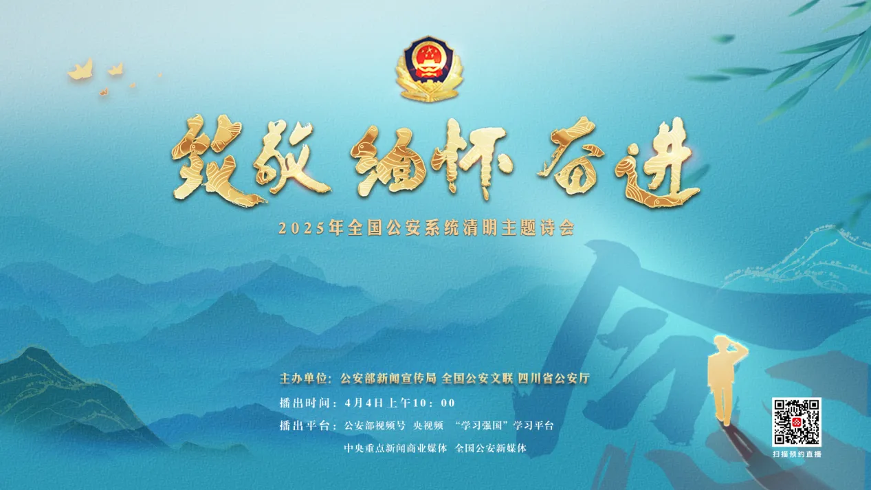 2025年4月4日10點,公安部新聞宣傳局、全國公安文聯、四川省公安廳聯合舉辦“致敬·緬懷·奮進”2025年全國公安系統清明主題詩會,致敬那些用生命守護平安的公安英烈。此次詩會將在公安部視頻號、央視頻、“學習強國”學習平臺、中央重點新聞網站、主要商業網站及其新媒體播出。