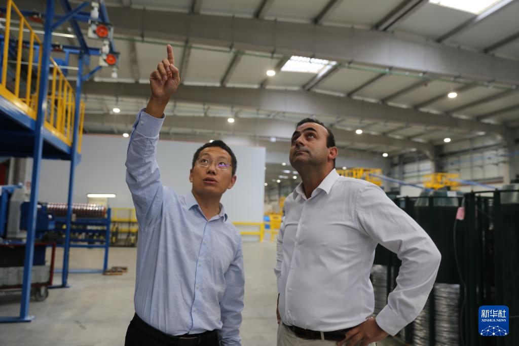 10月3日,在葡萄牙北部奧瓦爾市,亨通集團駐葡萄牙的設備經理劉建龍(左)與阿爾科夫雷電纜廠首席運營官卡洛斯·格蘭雅討論技術問題。新華社記者荀偉攝