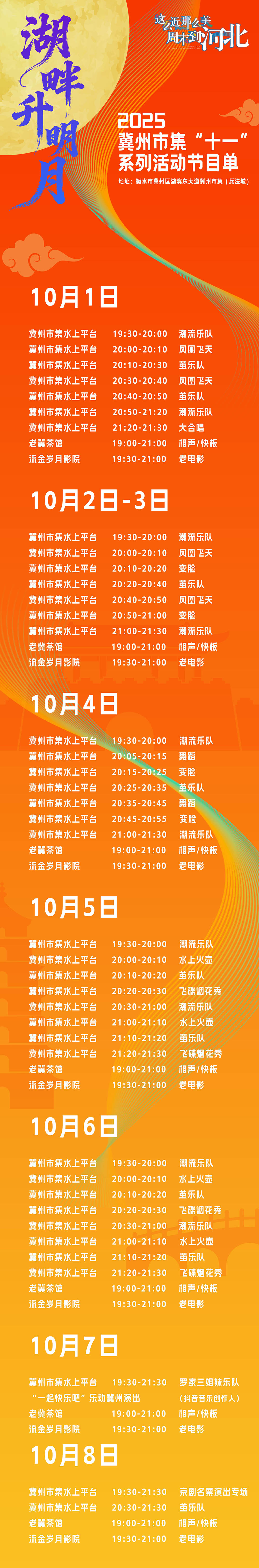 10月1日至4日每天19:30-21:30,10月5日-6日每天19:30-21:20;10月7日-8日每天19:30-20:30