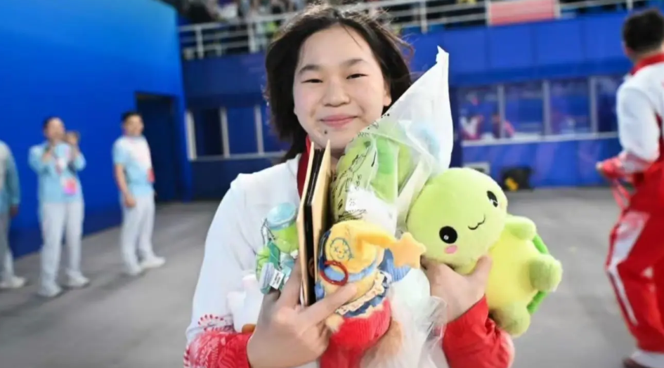 無數玩偶從天而降,其中不乏她最喜歡的烏龜玩偶,鏡頭捕捉到全紅嬋綻開的燦爛笑靨,也記錄下全場觀眾由衷的歡呼與吶喊。