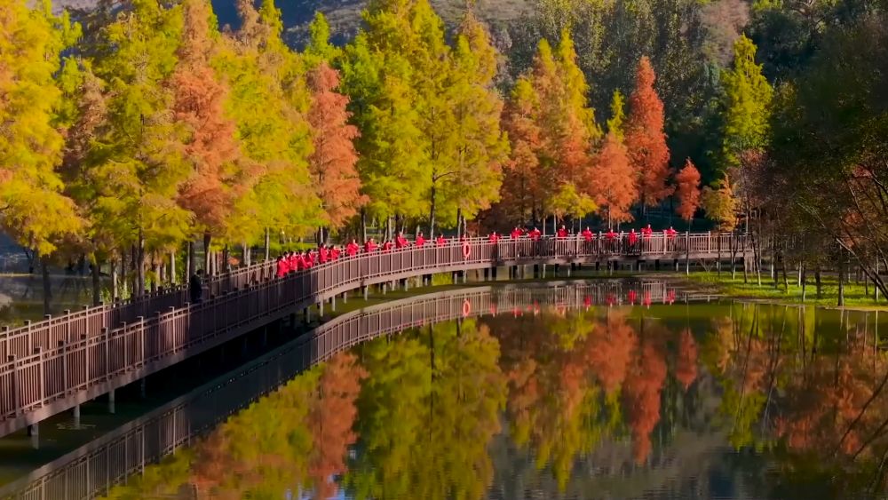 初冬,云南省大理白族自治州洱源縣茈碧湖濕地迎來最佳觀賞期。晴空之下,水天一色,水杉、棧道、候鳥同時(shí)入鏡,冷暖色調(diào)相互映襯,形成了一幅色彩斑斕的山水畫卷,吸引了眾多游客前來觀賞。