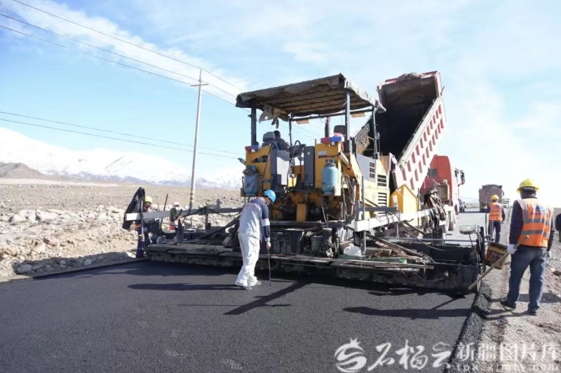 10月17日,哈密市天山南坡鄉(xiāng)鎮(zhèn)連接線(二期)工程建設(shè)項(xiàng)目二標(biāo)段的施工現(xiàn)場,攤鋪機(jī)正有條不紊地?cái)備仦r青路面。楊宏建攝